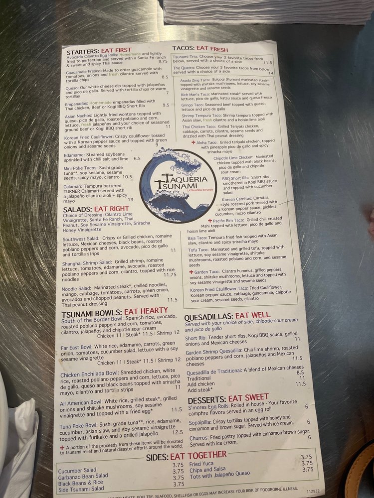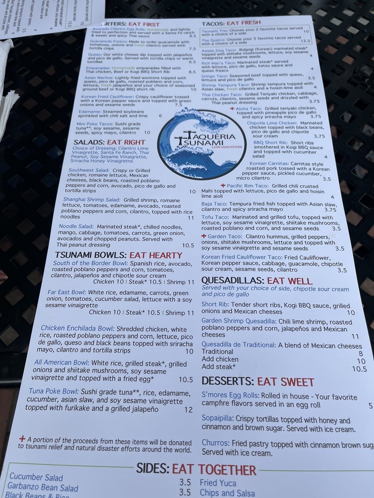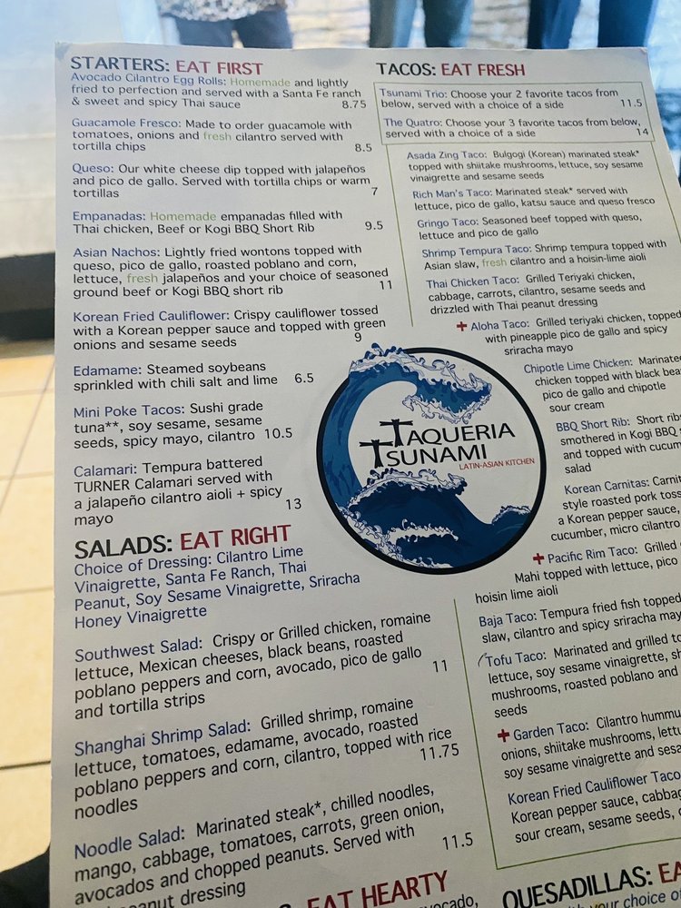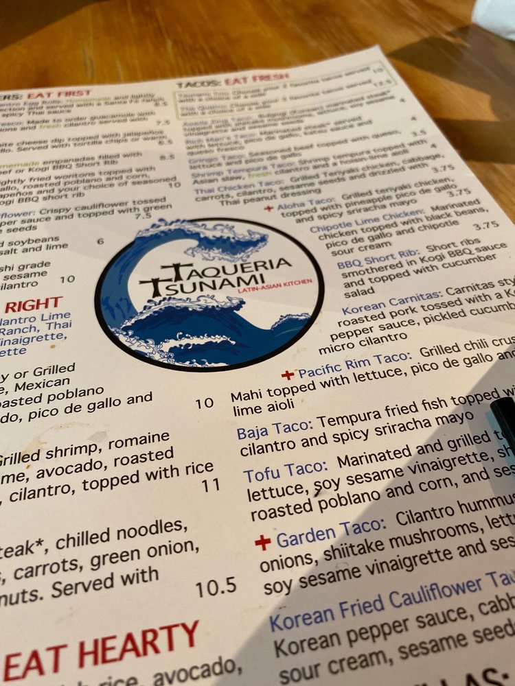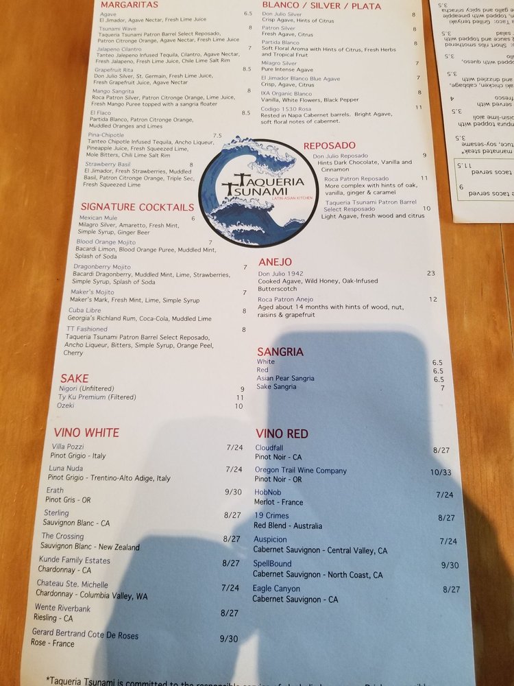 Taqueria Tsunami offers a unique blend of Asian and Mexican cuisine, specializing in tacos. Located in Marietta, Georgia, this restaurant caters to a wide range of dietary preferences with options for pescatarians, vegans, and vegetarians. The menu features a variety of flavorful dishes like avocado egg rolls, short rib quesadillas, Korean fried cauliflower, and creative taco options like Korean carnitas and shrimp tempura. Customer reviews praise the attentive service and enjoy the outdoor seating ambiance. Popular dishes include the Asian nachos, noodle salad, and tots with jalapeƱo queso. With a full bar, free Wi-Fi, and dog-friendly patio, Taqueria Tsunami provides a relaxed and trendy dining experience suitable for groups, families, and solo diners alike. Overall, the fusion of flavors and welcoming atmosphere make this restaurant a must-visit for those seeking a unique culinary experience.