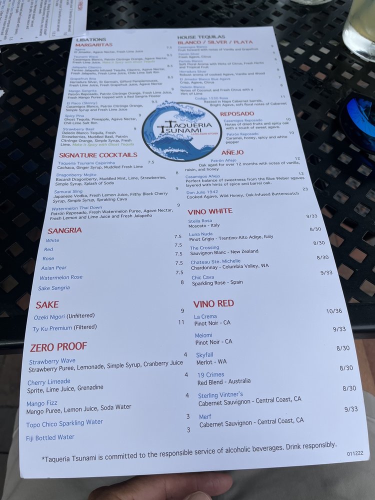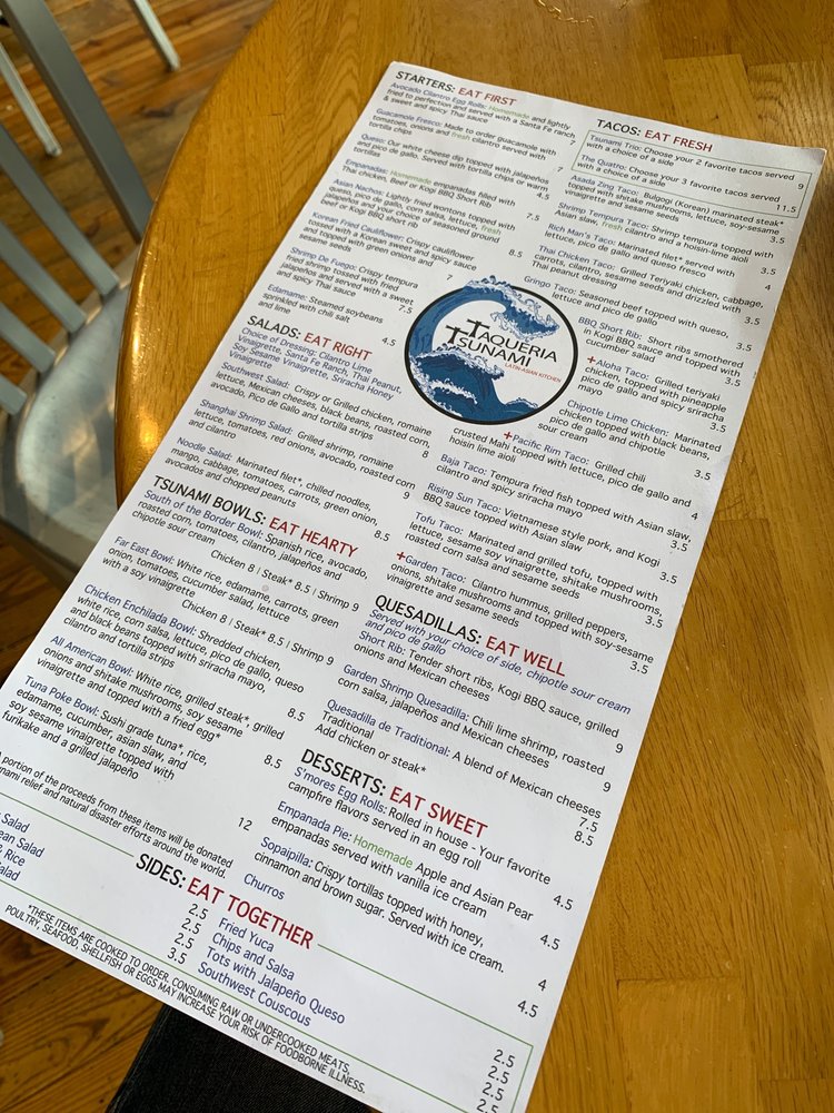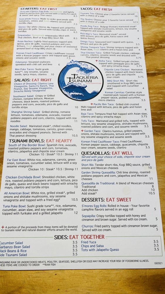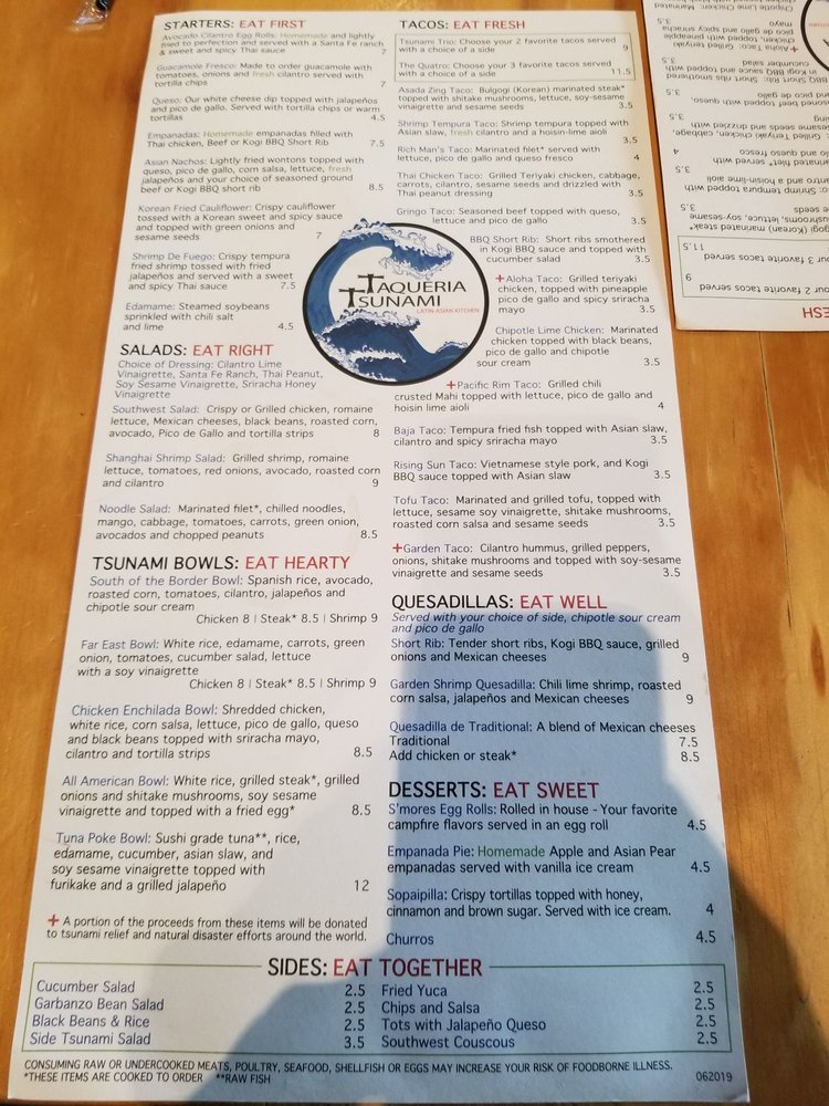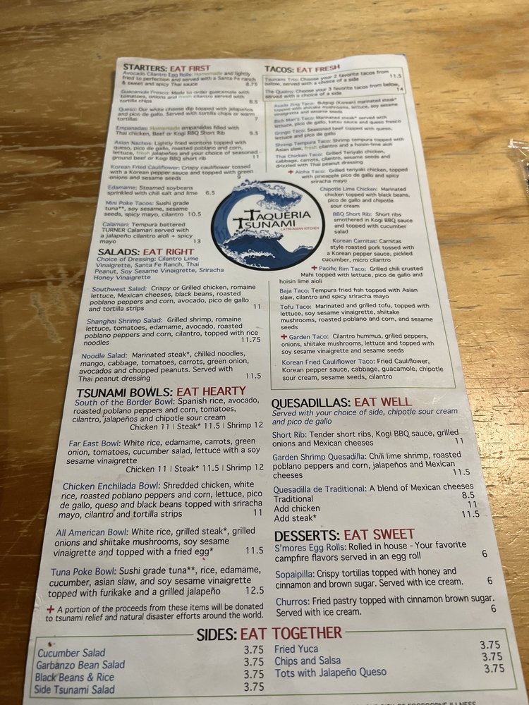 Taqueria Tsunami offers a unique blend of Asian and Mexican cuisine, specializing in tacos. Located in Marietta, Georgia, this restaurant caters to a wide range of dietary preferences with options for pescatarians, vegans, and vegetarians. The menu features a variety of flavorful dishes like avocado egg rolls, short rib quesadillas, Korean fried cauliflower, and creative taco options like Korean carnitas and shrimp tempura. Customer reviews praise the attentive service and enjoy the outdoor seating ambiance. Popular dishes include the Asian nachos, noodle salad, and tots with jalapeƱo queso. With a full bar, free Wi-Fi, and dog-friendly patio, Taqueria Tsunami provides a relaxed and trendy dining experience suitable for groups, families, and solo diners alike. Overall, the fusion of flavors and welcoming atmosphere make this restaurant a must-visit for those seeking a unique culinary experience.